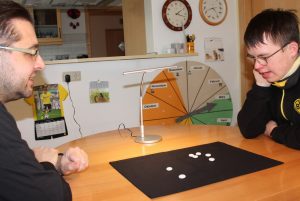 Als Besonderheit machen wir zu Beginn jeder Stunde Steinchenspiele zur Simultanerfassung. D.h. ich lasse eine gewisse Anzahl Steine (weiße Glassteine) auf ein Tuch fallen und Florian soll möglichst schnell sagen, wie viele es sind. Bei unseren ersten Treffen habe ich maximal fünf Steine fallen lassen und Florian hat ein und zwei Steine sehr schnell erkannt. Bei drei Steinen dauerte es etwas länger. Größere Anzahlen ermittelte er durch abzählen. Als ich nach einigen Wochen sieben Steine fallen ließ, schob Florian z.B. drei beiseite und ermittelte den Rest durch weiterzählen. Manchmal lege ich auch gezielt Muster oder Strukturen mit den Steinen. Bis heute machen wir diese Übungen zu beginn jeder Stunde. Allerdings nutzen wir eine größere Menge. manchmal sind es 12 oder 13; manchmal auch 20. Florian antwortet auch bei diesen großen Anzahlen nun meist so schnell wie ich. Denn natürlich darf Florian auch für mich Steine fallen lassen oder Muster legen. Auf dem Foto: