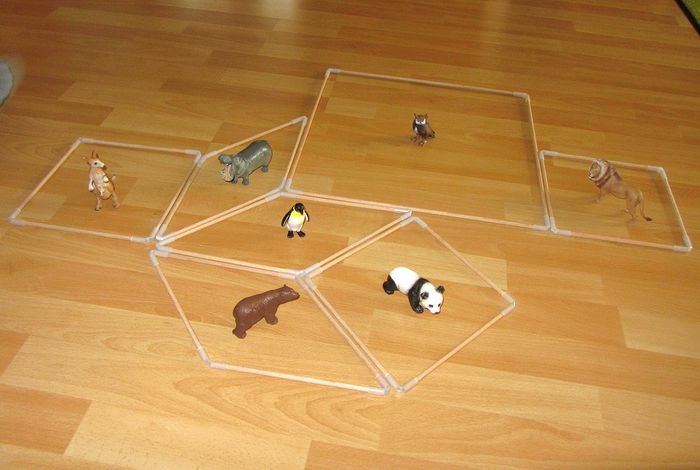 Die Kinder bekommen z.B. im Zoo vom Dreierland die Aufgabe Dreiecke aus den Stäben herszustellen. Nun soll der Zoo mit verschiedenen Gehegen und der Spielregel ‚Ecke an Ecke. Stab an Stab‘ gelegt werden. Auf den Fotos habe ich noch mit 50cm-Stäben kombiniert, die ich hier hatte. Das ist natürlich nicht nötig.