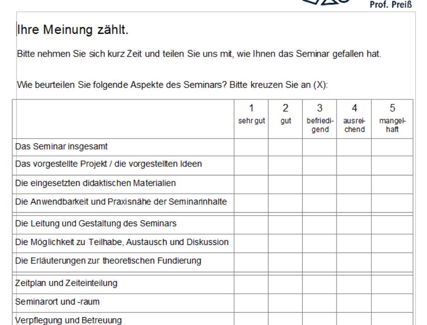 Projektunabhängiger Feedback-Bogen für alle Seminartypen: