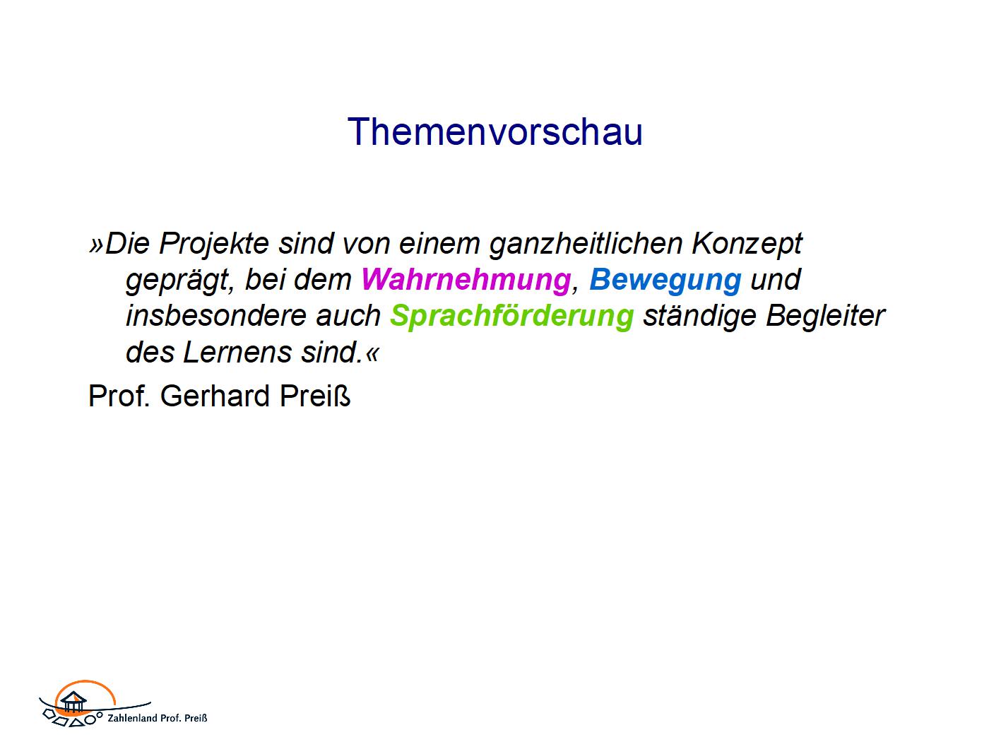 Für den Workshop hatte ich mit Frau Trübner abgesprochen den folgenden Satz von Gerhard Preiß in den Mittelpunkt zu stellen: »Die Projekte sind von einem ganzheitlichen Konzept geprägt, bei dem Wahrnehmung, Bewegung und insbesondere auch Sprachförderung ständige Begleiter des Lernens sind.« Prof. Gerhard Preiß