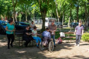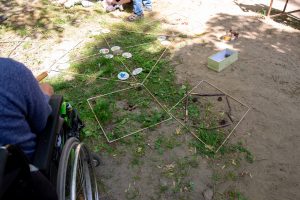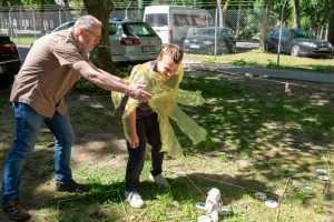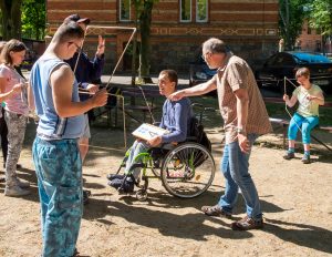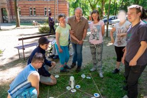 Gesagt, getan! Mit vereinten Kräften, auch einiger „Zaungäste“, die sich unser Treiben interessiert anschauten, gingen wir ans Werk. Sie wurden sofort angehalten, den jungen Leuten zu helfen, die es motorisch ein bisschen schwerer haben, die Stäbe zu einem Viereck zu verbinden, damit jeder den strengen Torwächter passieren kann.