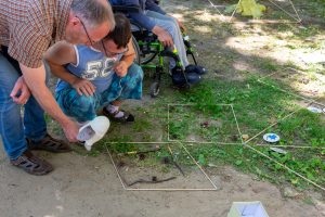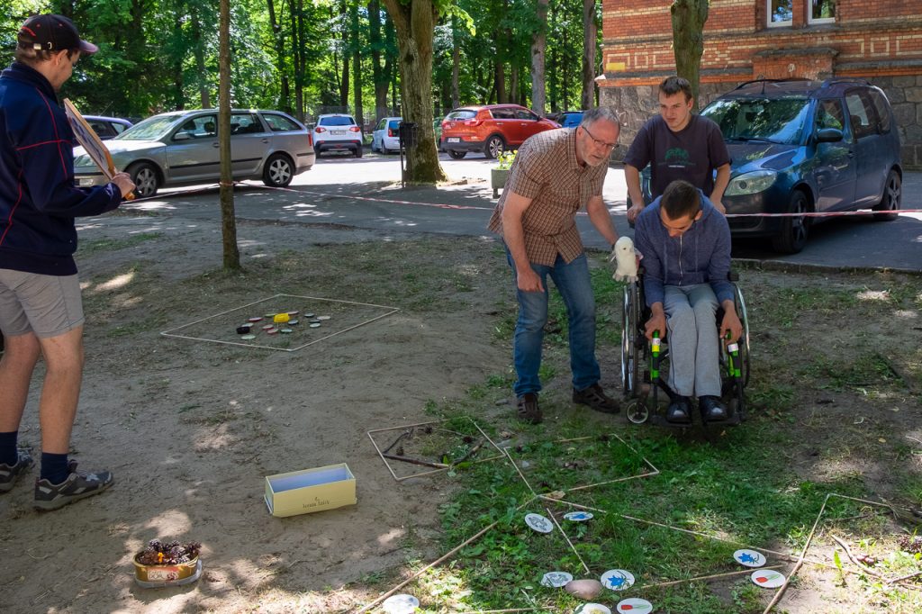 Gesagt, getan! Mit vereinten Kräften, auch einiger „Zaungäste“, die sich unser Treiben interessiert anschauten, gingen wir ans Werk. Sie wurden sofort angehalten, den jungen Leuten zu helfen, die es motorisch ein bisschen schwerer haben, die Stäbe zu einem Viereck zu verbinden, damit jeder den strengen Torwächter passieren kann.