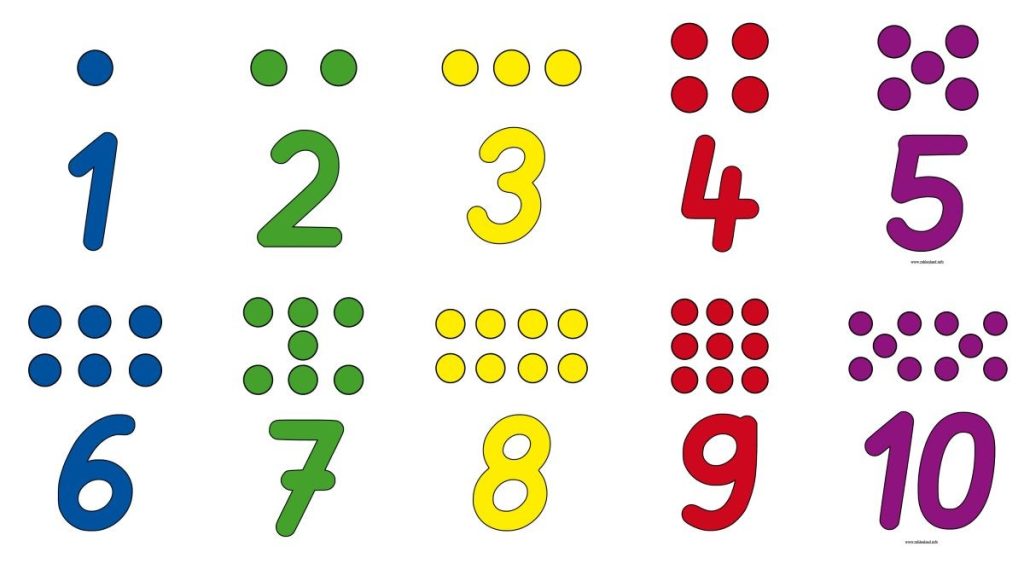 Dieses PDF-Dokument enthält für jede Zahl von 1 bis 10 eine A4-Vorlage mit der Zahl in Ziffernschreibweise und einer Punktebilddarstellung.