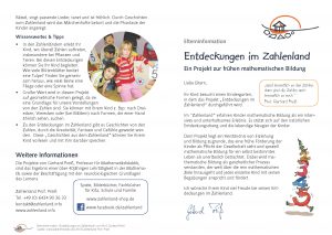 Unsere Elternflyer (DIN A5 Faltbroschüren) enthalten einen guten Überblick über das jeweilige Projekt. Sie können unsere Elternbroschüren direkt hier herunterladen und selbst ausdrucken oder in gedruckter Form als Faltflyer kostenfrei (innerhalb Deutschlands) im Zahlenlandbüro bestellen – solange der Vorrat reicht! Tel. 06434 90 36 33